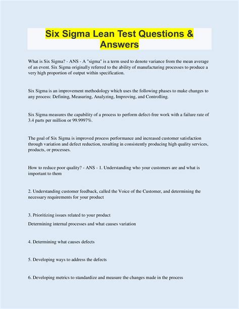 Read lean six sigma test answers Doc online is a convenient and frugal way to read lean six sigma test answers you love right from the comfort of your own home. Yes, there sites where you can get Doc "for free" but the ones listed below are clean from viruses and completely legal to use.